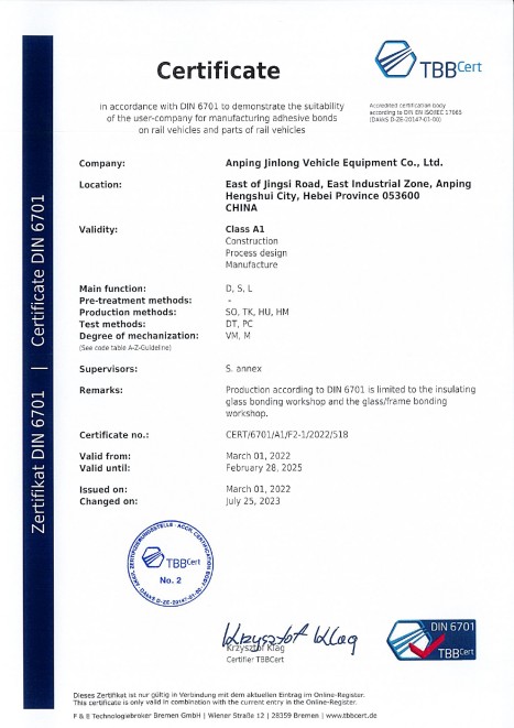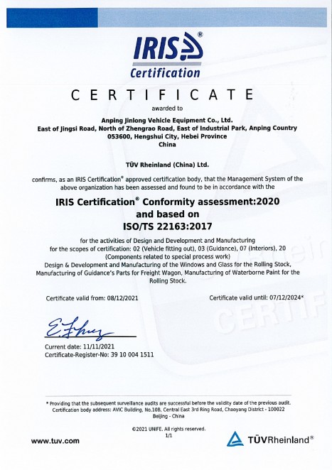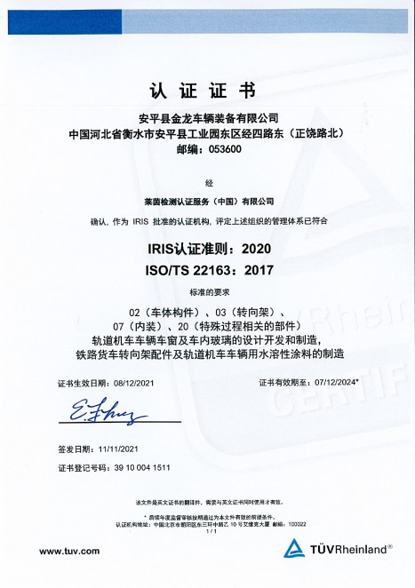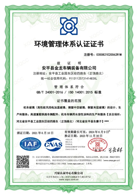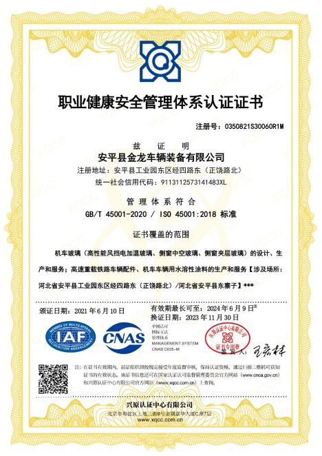 金龙装备拥有多项科学技术发明与专利并取得高新技术企业等资格认定,已通过ISO9001质量管理体系认证、铁道部CRCC铁路产品认证、CTC产品认证、EN15085国际焊接质量体系认证、ISO 22163 (IRIS)国际铁路行业标准体系、DIN6701国际粘接质量管理体系认证以及ECE欧盟安全玻璃材料统一规定认证等诸多认证。