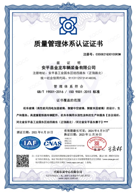 金龙装备注重产品质量,引进了众多光学检测设备来监控产品光学特性,如智能透射比测试仪,光畸变测定仪,碎片曝光控制仪,表面应力仪,电子万能试验机,耐辐照试验机,恒温恒湿试验箱,红外热成像仪,涡流测厚仪等,极大程度的保证了产品的各方面性能,也为我公司跻身轨道车辆玻璃及车窗总成领域奠定了坚实的基础。金龙装备在产品的生产环境和生产管理方面,按照国际标准对生产车间进行了优化设计,车间各工段布局锦然有序,配置了诸如高清洁等级合片室,恒温恒湿粘接室,封闭中空玻璃生产车间,实验室等设施,全厂深入贯彻实施ISO 9001质量管理体系,IRIS体系以及5S现场管理实践等,为质量过硬的产品提供了硬件和软件层次的双重保证。
